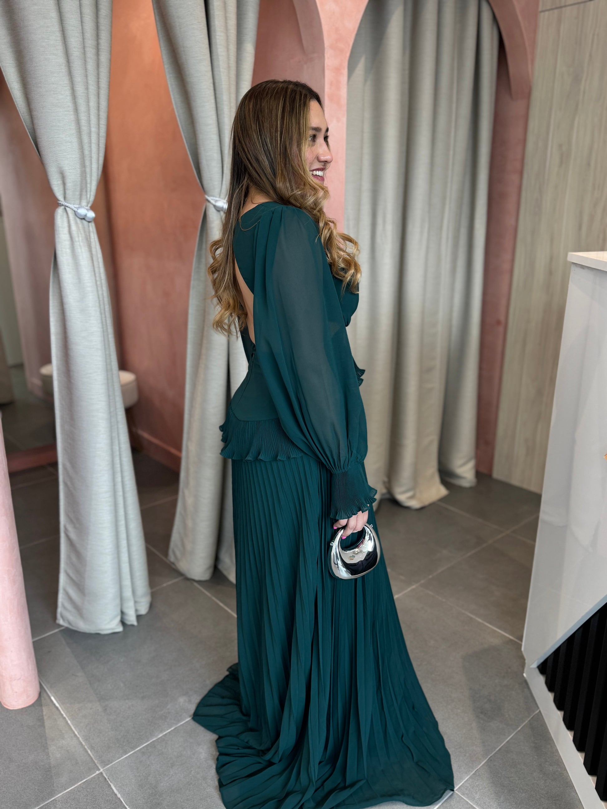 Vestido color Esmeralda, plisado largo con espalda afuera