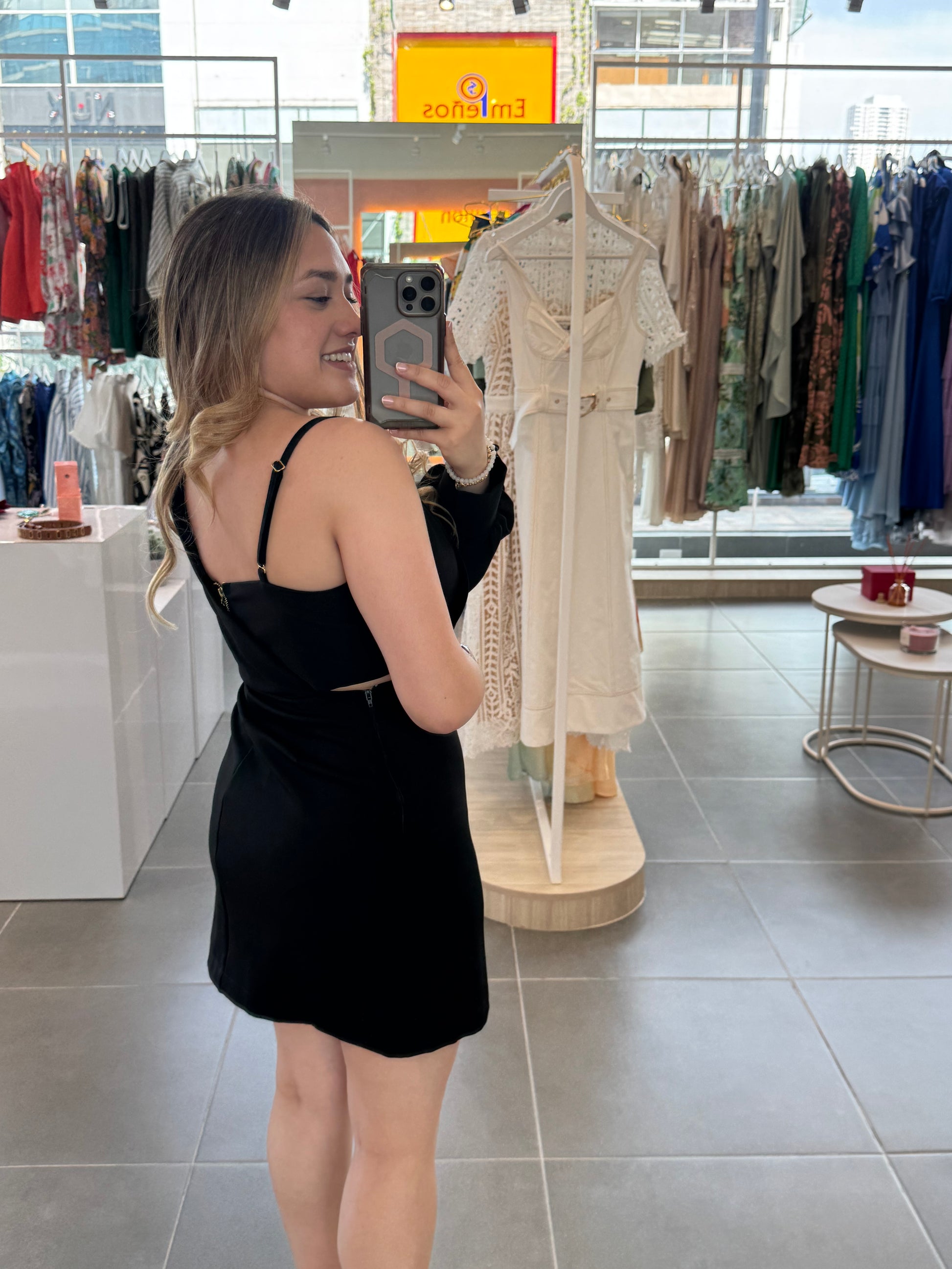 Vestido negro Gina redefine la elegancia moderna con su diseño, asimétrico y detalles únicos. Su silueta estructurada combina feminidad y fuerza, destacando un delicado tirante metálico y una manga globo que aporta volumen y sofisticación.