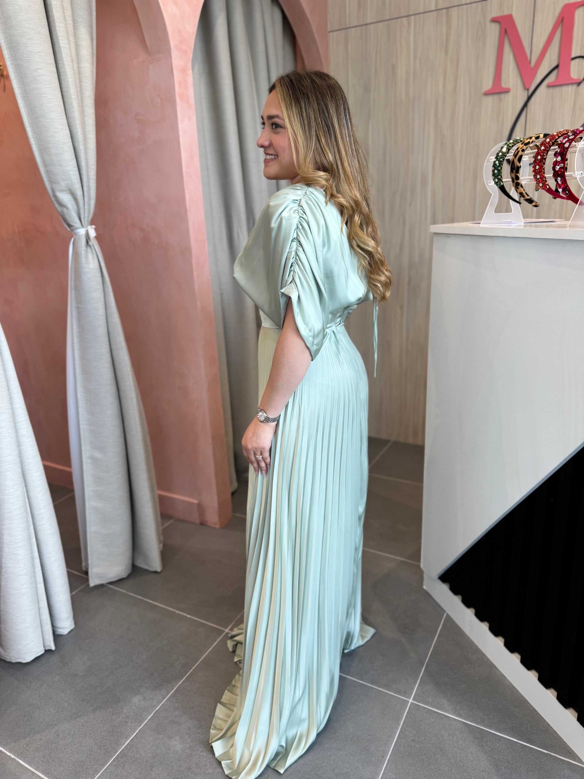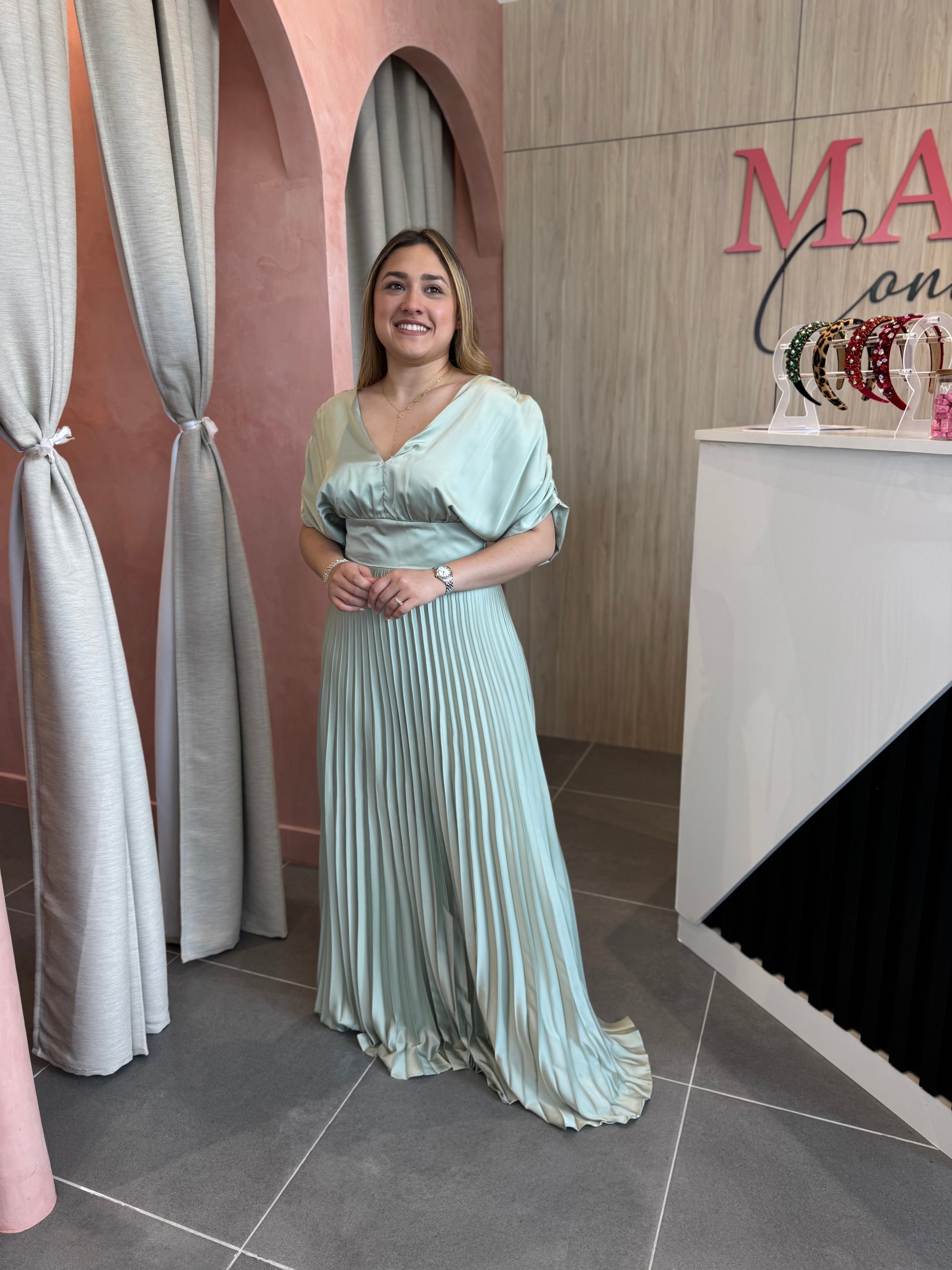El vestido Amalia verde claro es puras sofisticación en tonos suaves. Su diseño plisado con escote en V y cinturón que define la cintura. Realiza la silueta con elegancia. El movimiento de la falda y el brillo sutil de la tela seda italiana, crea una presencia perfecta para eventos de día o de noche.